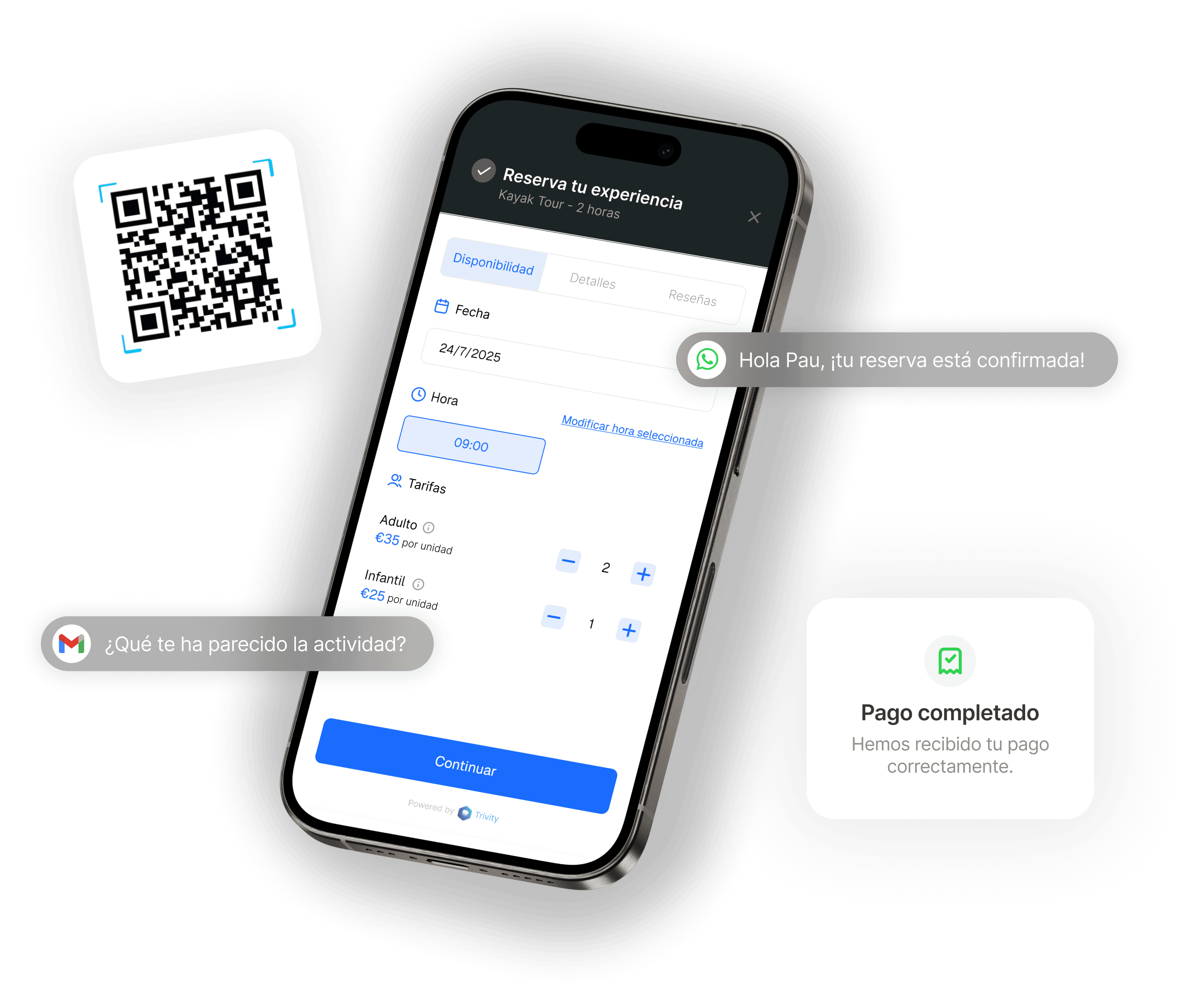 Ofrece un catálogo variado y personalizable, para que cada cliente encuentre la actividad perfecta. Tus huéspedes eligen y reservan cuando quieran, las 24 horas del día.